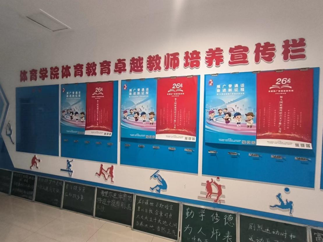 围绕推普主题在学院卓越教师培养宣传栏、展板等醒目位置张贴推广普通话宣传海报,营造了浓厚的推普氛围。此外,学院还充分调动起广大师生推普宣传的积极性,通过发动体育教育专业学生每人上交小黑板展示粉笔字,组织教师撰写心得展示硬笔书法等多种方式,引导学院广大师生不断增强自觉规范使用国家通用语言文字的意识,提高了语言文字应用能力。